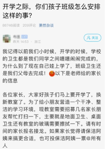 据杭州日报,最近,有萧山家长发帖称,开学之际,收到老师发给家长们的通知:教室需要打扫,有时间的家长可以接龙报名,也可以选择请保洁阿姨来做。不少网友表示,小时候开学,自己打扫卫生,长大了孩子开学,还要帮孩子去打扫卫生。